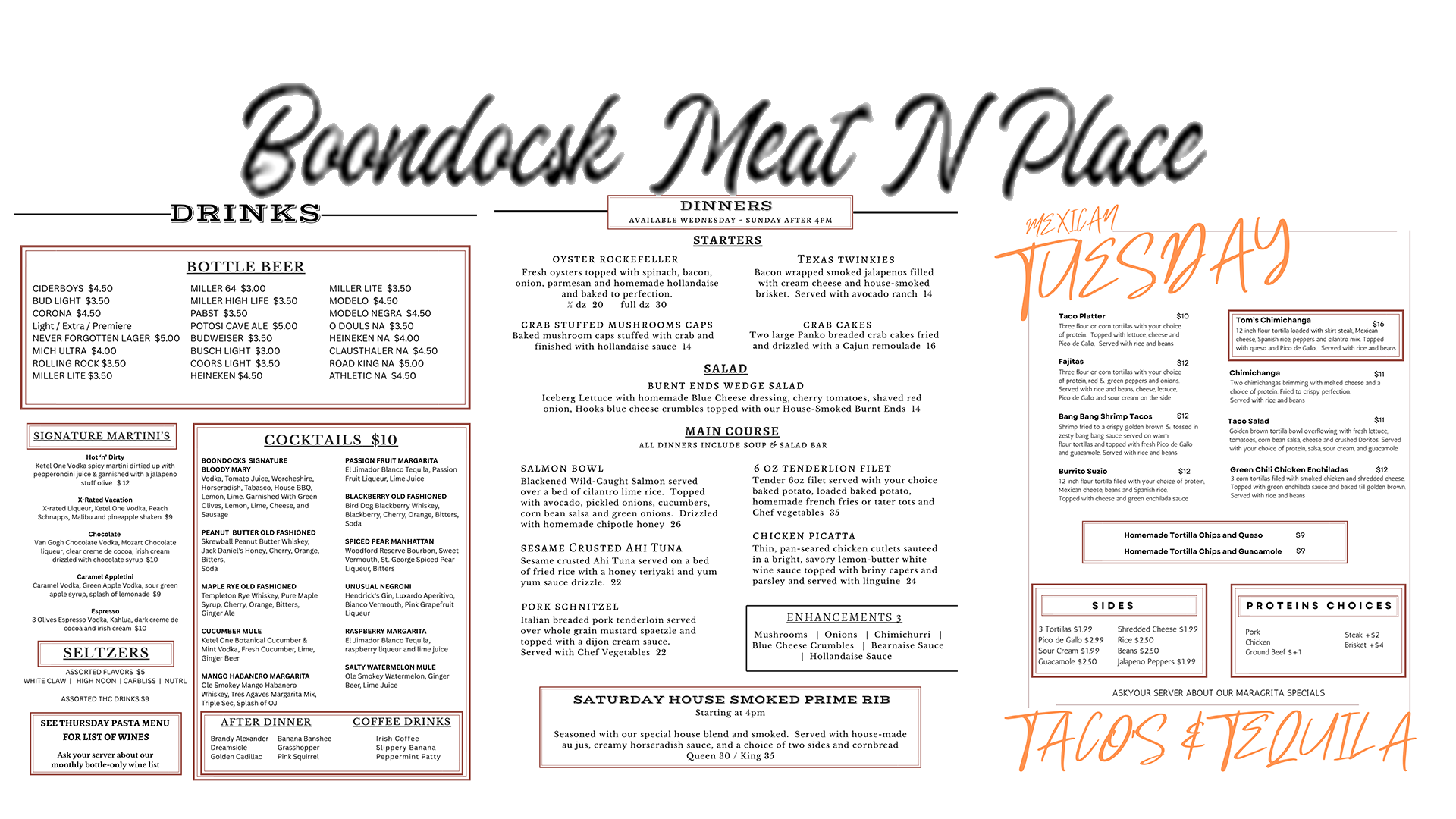 Experience the new flavors of Boondocks Meat’N’Place with a new dinner menu offered Wednesday through Sunday after 4pm. Mexican Tuesdays, Thursday Night Pasta, Friday Night Fish Fry, Sunday Brunch